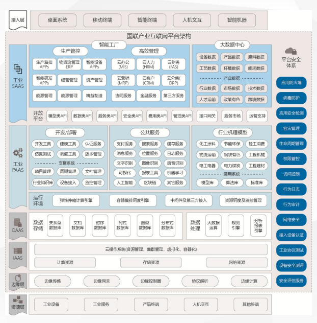 在生產區(qū)和中控區(qū)進行升級,通過實施IOT物聯網平臺、大數據平臺和AI智能生產平臺,以此來建立一個基于海量工業(yè)數據采集、匯聚、分析的數據管理與分析的服務體系。在工廠生產側,通過部署采集器、邊緣網關、邊緣服務器、安全網閘,進行大范圍、深層次的數據采集。通過構建精準、實時、高效的管理與分析體系,實現工業(yè)技術、經驗、知識的模型化、標準化、軟件化、復用化,配合工廠技術人員,不斷優(yōu)化研發(fā)設計、生產制造、運營管理。