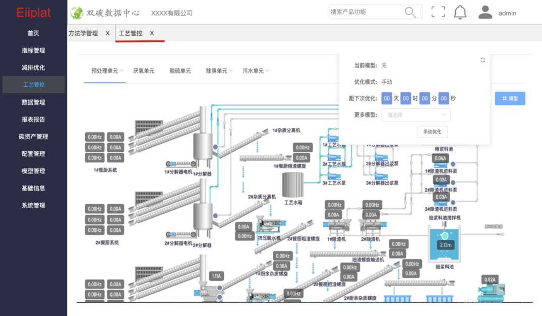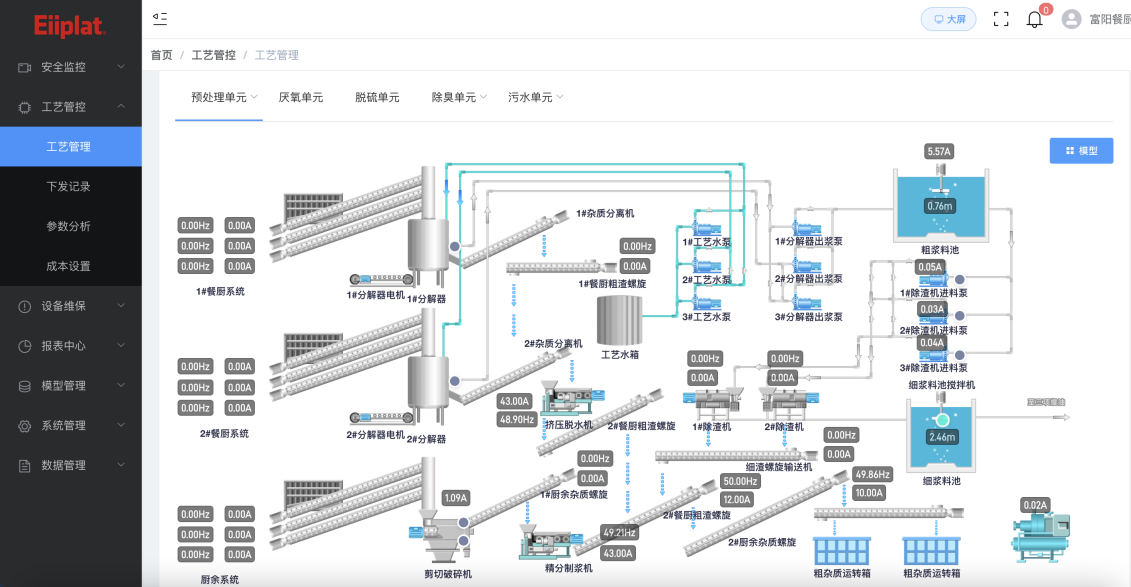 富陽區循環經濟產業園餐廚垃圾處置項目內各工藝單元運行情況良好、各類數據采集相關傳感器、智能網關硬件設施完備,以此為基礎利用數字技術賦能富陽區循環經濟產業園餐廚垃圾處置項目降碳。