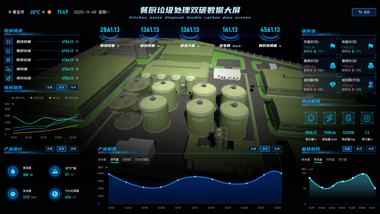 利用數字技術賦能垃圾處置廠降碳解決方案案例應用于杭州市富陽區循環經濟產業園餐廚垃圾處置項目。項目位于杭州市富陽區,設計規模日處理300噸餐廚/廚余垃圾,項目資源化利用后,年發電量700萬度、年產工業油脂3000噸,可實現項目減量化、無害化、資源化處置,是浙江省的重點示范項目。該項目工程于2020年5月開工建設,2020年12月餐廚垃圾車進場卸料,歷時7個月,實現了可視化、智能化、平臺化的運營管理,用實際行動響應杭州提出的打造全國數字經濟第一城的號召。