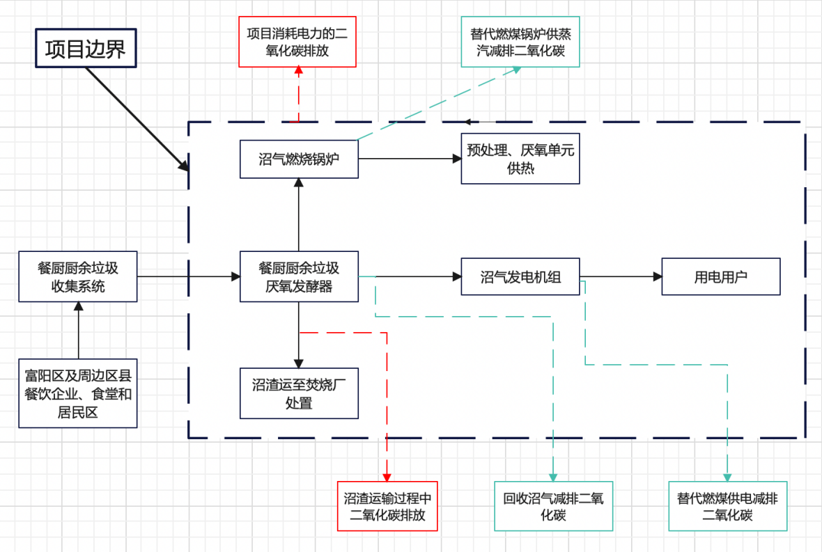 根據國家發改委備案的方法學CMS-001-V02用戶使用的熱能,可包括或不包括電能和CMS-016-V01通過厭氧分解進行甲烷回收,項目碳核算的邊界為餐廚廚余垃圾從產生單位運輸至處理廠后,進行厭氧發酵,產生沼氣一部分進入燃燒鍋爐產生蒸汽進行供熱,另一部分進入沼氣發電機發電上網,產生的沼渣外運至焚燒廠焚燒。