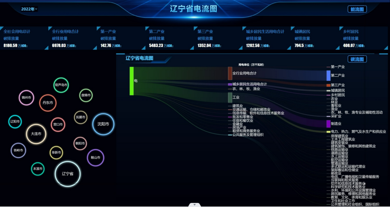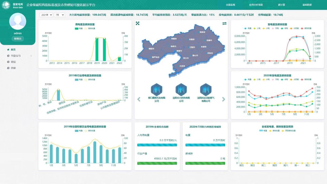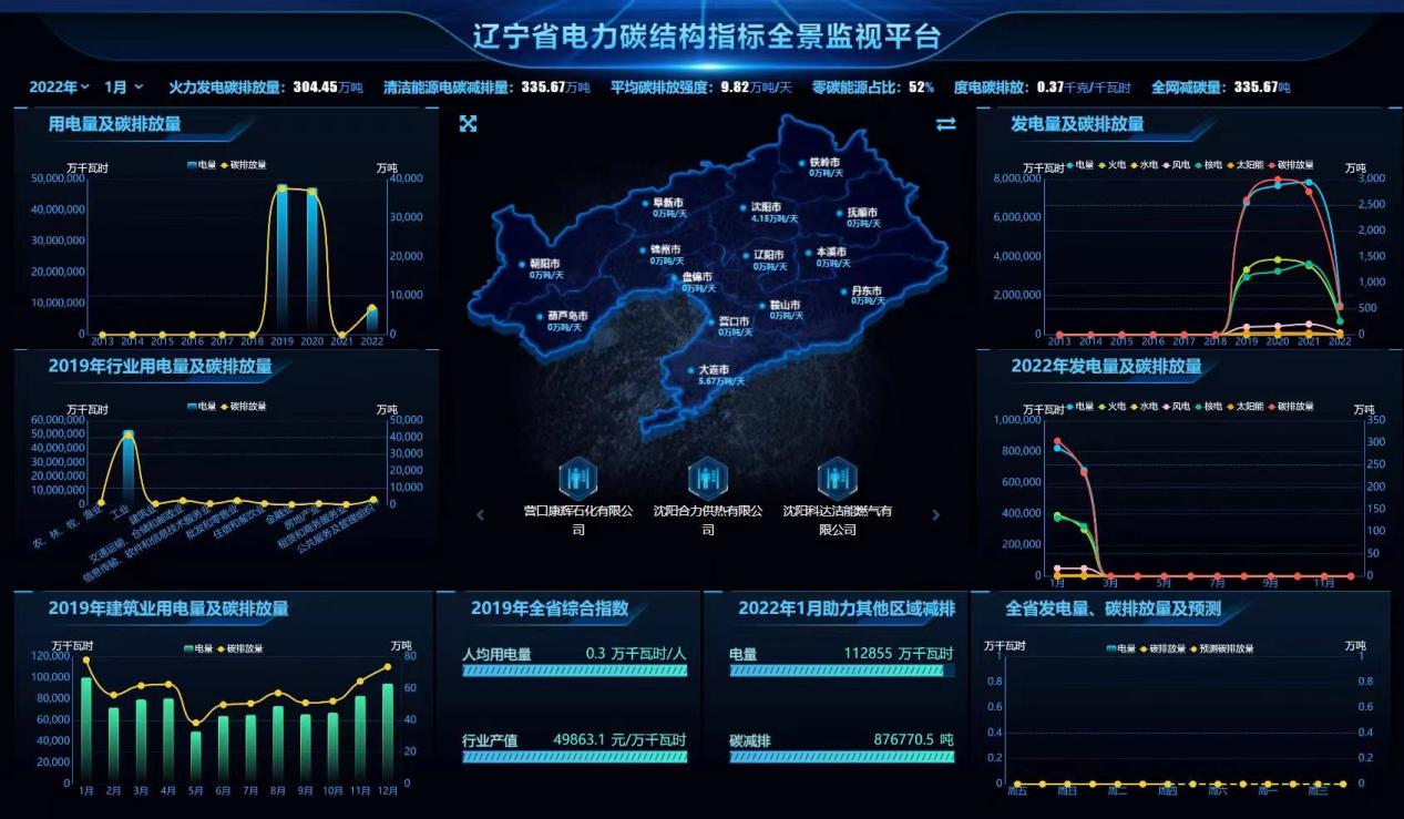國家發(fā)展和改革委員會應(yīng)對氣候變化司組織國家應(yīng)對氣候變化戰(zhàn)略研究和國際合作中心研究確定了中國區(qū)域電網(wǎng)的平均二氧化碳排放因子。平臺基于遼寧省電碳熱力圖,火力發(fā)電碳排放量、平均碳排放強度等20項電碳指標,通過清潔能源占比、碳排放量增量、碳排放速率變化量、外送電量增量、清潔能源消納程度5個維度,構(gòu)建區(qū)域“雙碳”綜合指數(shù)。通過“雙碳”綜合指數(shù)的開發(fā),可以更全面的度量區(qū)域碳排放的實際情況,增加了碳排放管理的科學工具。在“雙碳”綜合指數(shù)的應(yīng)用上,如何支持政府在產(chǎn)業(yè)調(diào)整、新上項目、創(chuàng)新發(fā)展等方面的具體決策,科學指導(dǎo)政府規(guī)劃計劃和實際工作落地實施,是輔助城市政府推進“雙碳”工作的重點。