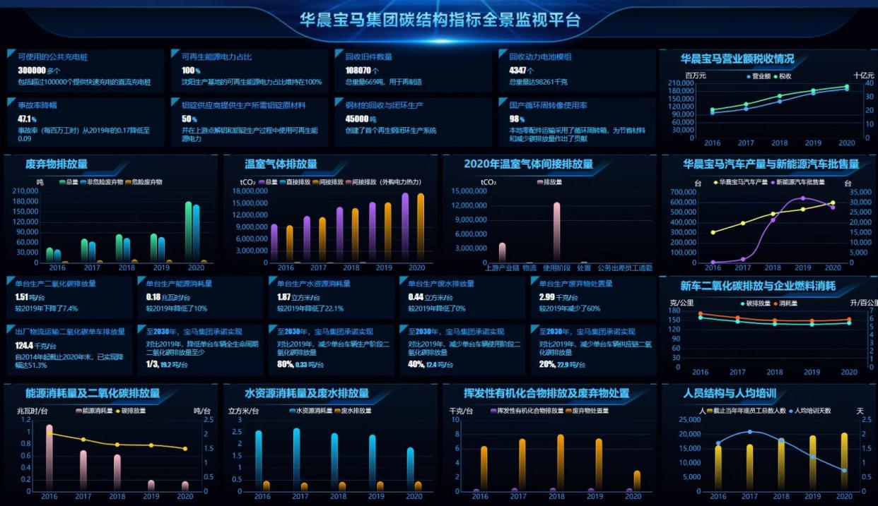 寶馬集團作為中德(沈陽)高端制造產(chǎn)業(yè)園規(guī)模較大的企業(yè),是我省先進制造企業(yè)的典范,具有較強的代表性。平臺通過匯集寶馬運營、企業(yè)應(yīng)用(華晨寶馬集團)供應(yīng)鏈相關(guān)數(shù)據(jù),以及車輛使用等碳排放相關(guān)關(guān)鍵績效指標,深度剖析華晨寶馬全產(chǎn)業(yè)鏈碳指標數(shù)據(jù),利用可視化技術(shù)實現(xiàn)碳排放多維度全景監(jiān)測。通過汽車生產(chǎn)過程中主要資源消耗和排放量的匯總統(tǒng)計與對比分析,監(jiān)測企業(yè)的能源消耗結(jié)構(gòu)特點和變化趨勢,為企業(yè)制定降碳增效方案、進一步實現(xiàn)節(jié)能減排、提高綠色發(fā)展水平提供數(shù)據(jù)支撐。具體內(nèi)容如下: