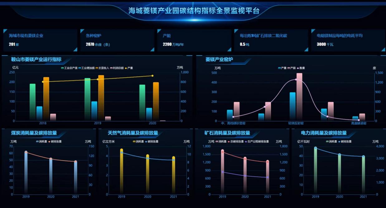 海城菱鎂產(chǎn)業(yè)園是我省優(yōu)勢資源開發(fā)的典型代表,實現(xiàn)碳排放多維度全景監(jiān)視及分析,對加強產(chǎn)業(yè)園的能源監(jiān)管和促進產(chǎn)業(yè)健康發(fā)展意義重大。平臺利用可視化技術(shù)實現(xiàn)海城菱鎂產(chǎn)業(yè)園碳排放多維 度全景監(jiān)視及分析,可以有效監(jiān)控企業(yè)的能源消耗和碳排放情況,構(gòu)建企業(yè)能源消耗與碳排放的相關(guān)性分析,提升外在和自身的檢查管理能力,引導(dǎo)企業(yè)節(jié)能減排,為可持續(xù)綠色發(fā)展提供保障。