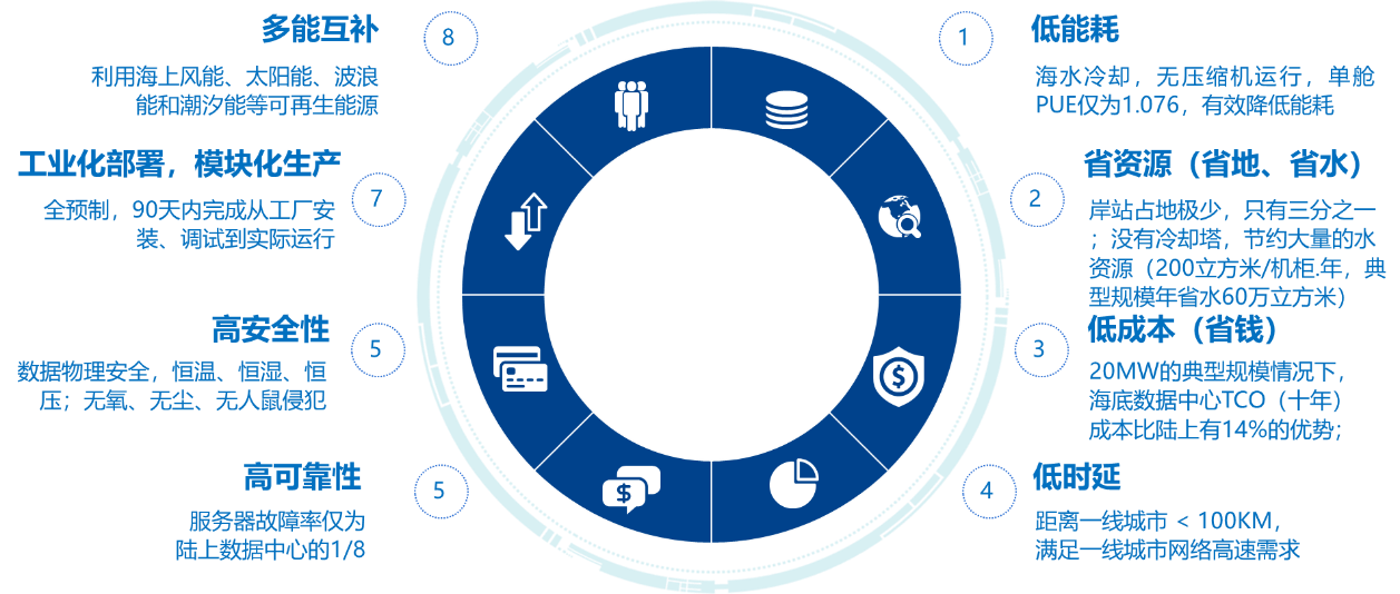 依靠海水自然冷源、無氧、無塵、模塊化部署等條件,海底數據中心在能耗、土地、水資源、故障率、交付周期等方面較陸地數據中心有著獨特的優勢。根據清華大學傳熱與能源利用北京重點實驗室出具的能效測試報告,海底數據中心的單艙PUE值為1.076。這一指標保證了海底數據中心節能降耗,在其生命周期內具備比陸地數據中心更好的經濟優勢。由于海底數據中心散熱不需要消耗水,運營過程中每年每個機柜可以節約200立方米的水資源。海底數據中心通過工程預制實現了快速部署,建設由“工地”遷移到“工廠”,具備了工業化的本質,可實現一體化交付,規模化運維。我國東部地區具有臨海的區位優勢,集聚了全國超過45%的人口和近60%的GDP。對于上海、深圳這一類沿海超大城市,海底數據中心的價值特點尤為突出。
