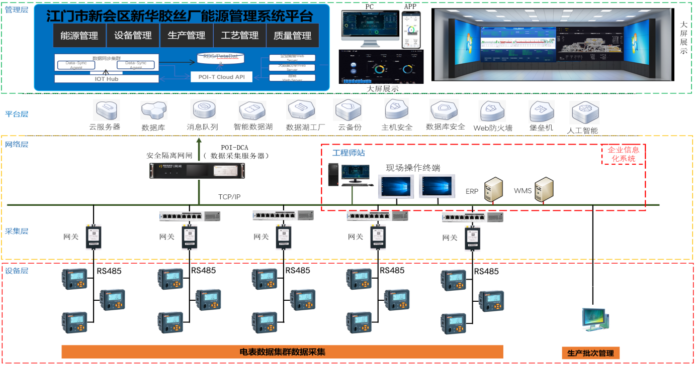 面向場景:打造了一套新華膠絲廠能耗在線監(jiān)測管理系統(tǒng)平臺,具備與ERP等上層信息系統(tǒng),以及一期項(xiàng)目的工廠數(shù)字化制造運(yùn)營系統(tǒng)、現(xiàn)場儀器儀表、設(shè)備的集成能力,并將這些實(shí)時(shí)數(shù)據(jù)存入本地MySQL數(shù)據(jù)庫,為未來企業(yè)發(fā)展新系統(tǒng)的集成,打下穩(wěn)定、擴(kuò)展性的基礎(chǔ)。