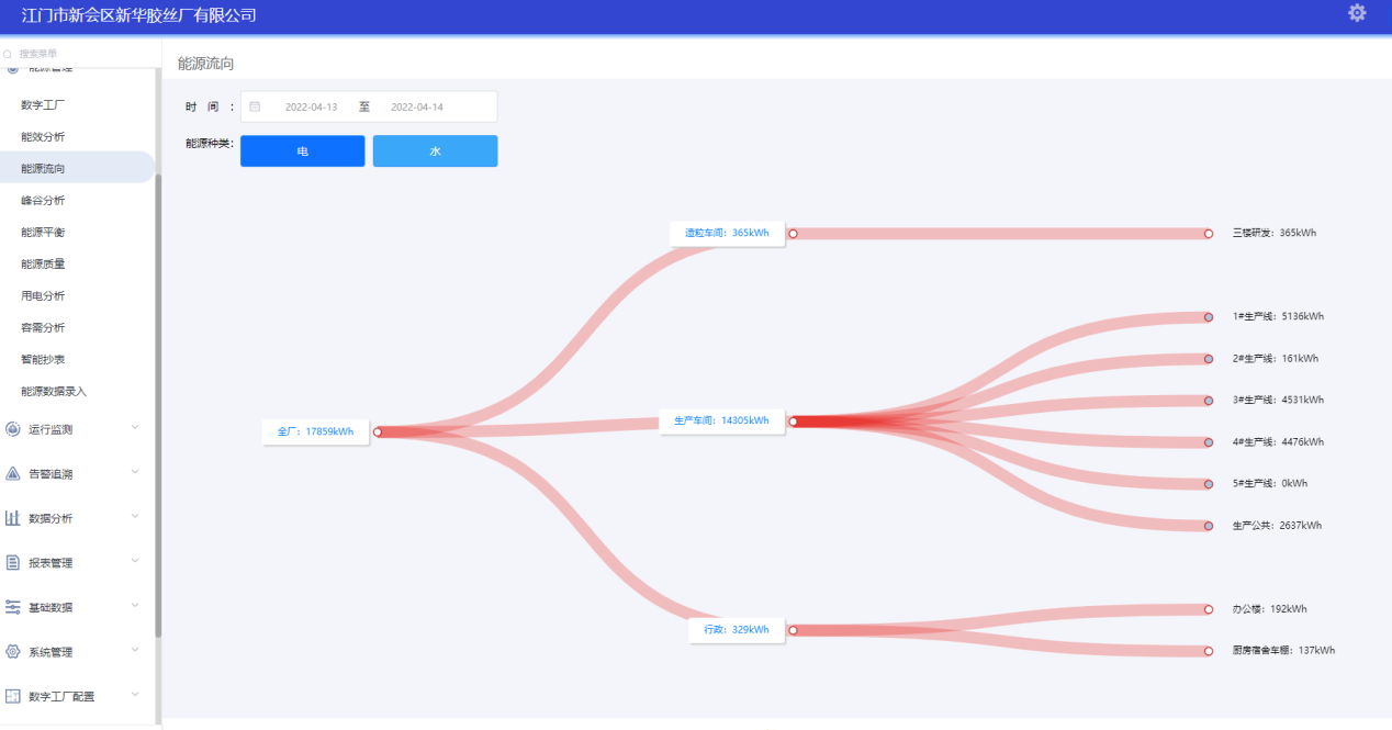 新華膠絲廠生產(chǎn)能源流向動(dòng)態(tài)監(jiān)測(全廠→生產(chǎn)車間→生產(chǎn)線→重點(diǎn)耗能設(shè)備等);通過能源流向圖,可以查看能源消耗的去向,也可以查看不同區(qū)域能源利用比例情況。該能流圖能夠?qū)崟r(shí)顯示生產(chǎn)過程中不同能源的消耗數(shù)據(jù)。