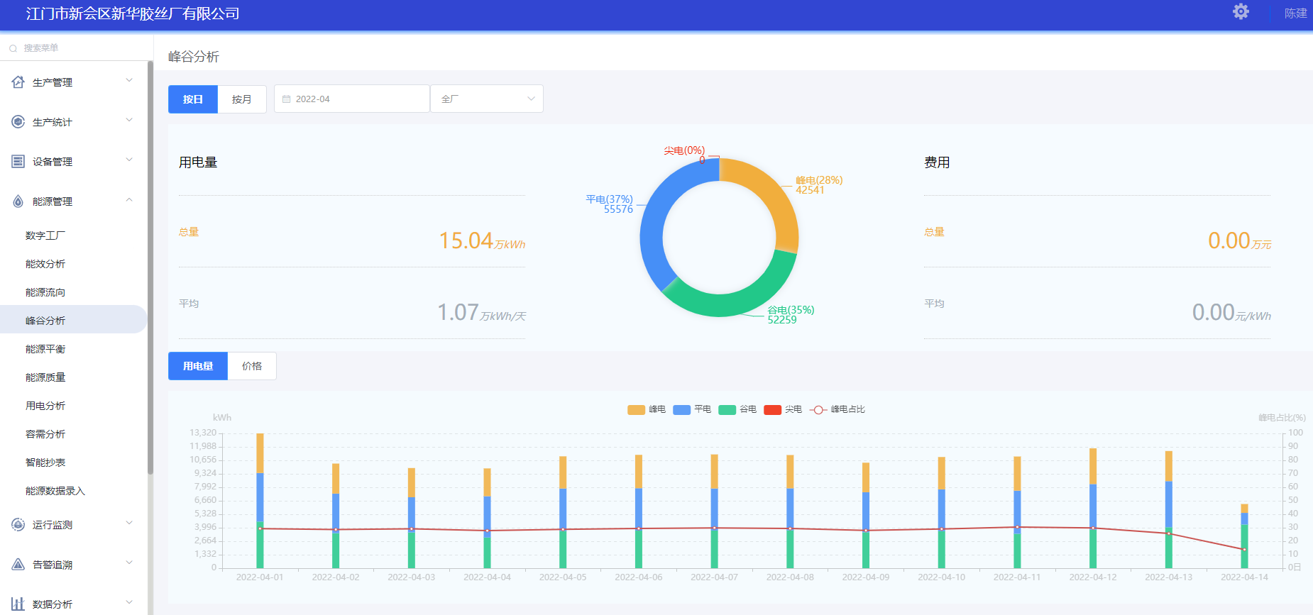 新華膠絲廠生產(chǎn)用電峰谷平數(shù)據(jù)在線監(jiān)測,反映企業(yè)錯(cuò)峰用電實(shí)際狀況、錯(cuò)峰用電占比情況。對企業(yè)歷史用電量及電費(fèi)(錄入)進(jìn)行統(tǒng)計(jì)分析,有助于合理調(diào)度高耗能設(shè)備啟停區(qū)間,減少峰電比例,節(jié)約生產(chǎn)能源成本。展示各廠峰谷用電的實(shí)物量及占比,通過峰谷平用電比例指導(dǎo)車間及工序合理排產(chǎn),提高用電的效率和經(jīng)濟(jì)性。