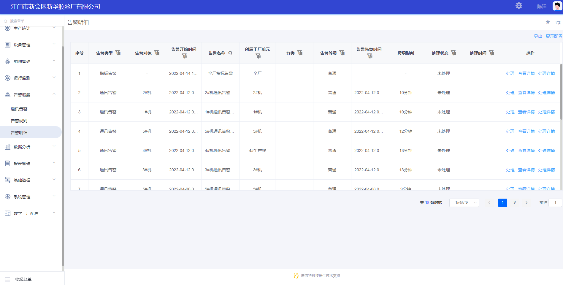 告警追溯模塊實(shí)現(xiàn)設(shè)備運(yùn)行異常、能耗異常等生產(chǎn)異常實(shí)時(shí)告警與追溯。所有報(bào)警變量及其上、下限新華膠絲廠可以自定義,當(dāng)發(fā)生異常時(shí),對應(yīng)的工段或者設(shè)備以閃爍、改變顏色或發(fā)短信等告警形式提醒相關(guān)人員。告警晴雨表以廠區(qū)拓?fù)鋱D(工廠模型)的形式直觀展示,告警類型包括通訊告警、指標(biāo)告警、參數(shù)告警。