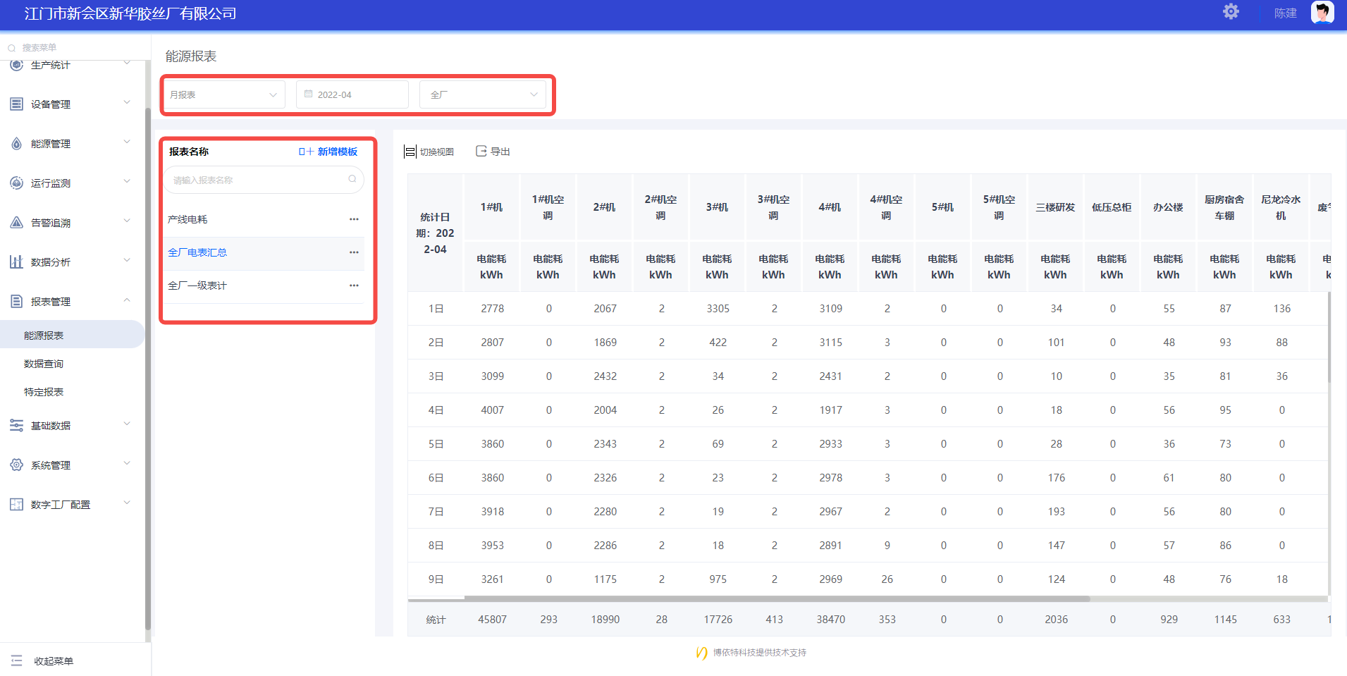 報(bào)表是新華膠絲廠生產(chǎn)數(shù)據(jù)匯總的主要形式。報(bào)表管理模塊分為定制化報(bào)表和自定義報(bào)表兩大類別,實(shí)現(xiàn)自動(dòng)抄表;能耗報(bào)表自動(dòng)生成;并支持用戶進(jìn)行自定義報(bào)表。報(bào)表管理模塊能夠有效解決企業(yè)生產(chǎn)報(bào)表種類、數(shù)據(jù)量繁多,統(tǒng)計(jì)耗時(shí)長,工作量大等問題,同時(shí)能夠提高報(bào)表數(shù)據(jù)的準(zhǔn)確性和實(shí)時(shí)性。(報(bào)表支持EXCEL導(dǎo)出)。