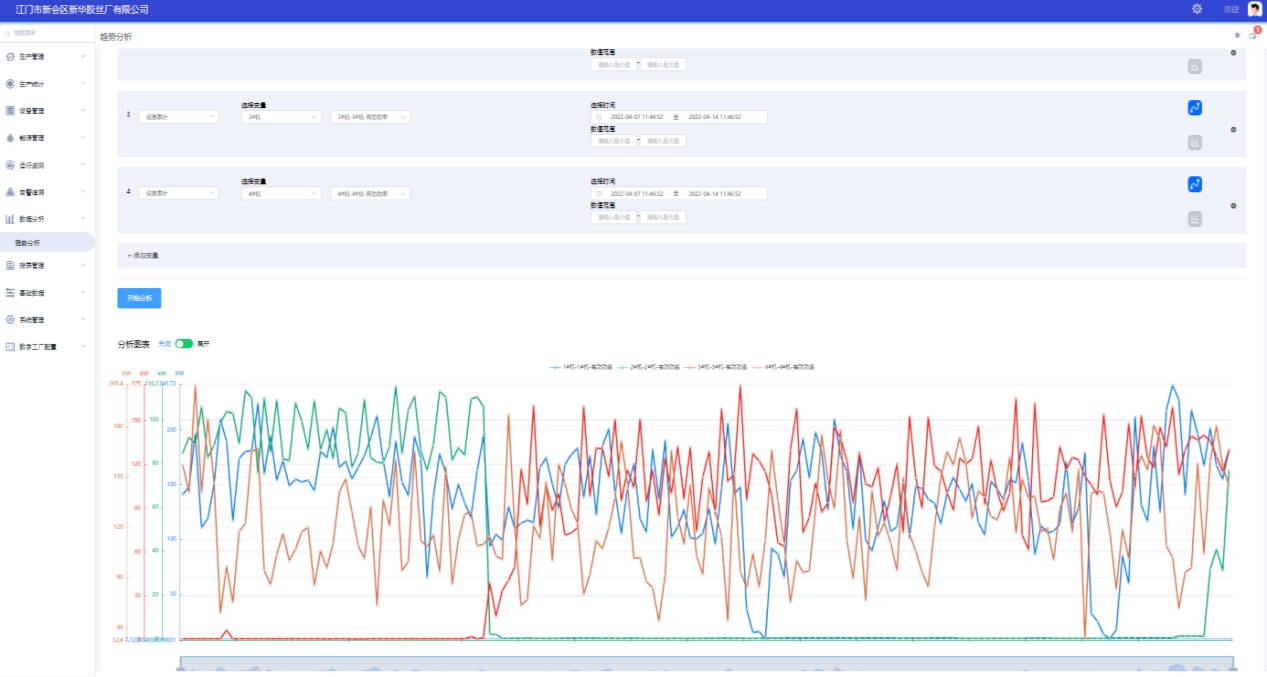 趨勢分析:可以根據(jù)區(qū)域、工序、設(shè)備,選取特定時(shí)間區(qū)域內(nèi)的相關(guān)參數(shù)進(jìn)行趨勢分析比對,自定義選擇分析方案。同一坐標(biāo)軸添加不同參數(shù)、指標(biāo)進(jìn)行關(guān)聯(lián)分析。可以通過將幾個(gè)相關(guān)的參數(shù)在同一段時(shí)間進(jìn)行關(guān)聯(lián)分析,查找關(guān)鍵影響因子,有助于相關(guān)人員追溯生產(chǎn)異常或改進(jìn)生產(chǎn)工藝。