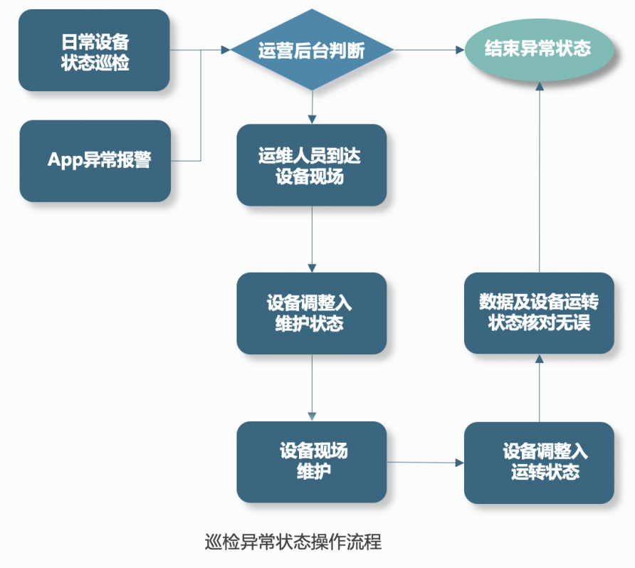 為了及時解決各類突發(fā)問題造成的設(shè)備告警,保證監(jiān)測設(shè)備穩(wěn)定運(yùn)行,根據(jù)后臺信息實(shí)時查看設(shè)備狀況,實(shí)施單位進(jìn)行定期或臨時的設(shè)備運(yùn)維。依照設(shè)備檢定流程,實(shí)施單位定期對設(shè)備狀態(tài)進(jìn)行巡檢,發(fā)現(xiàn)設(shè)備狀態(tài)異常后,按照如下流程處理: