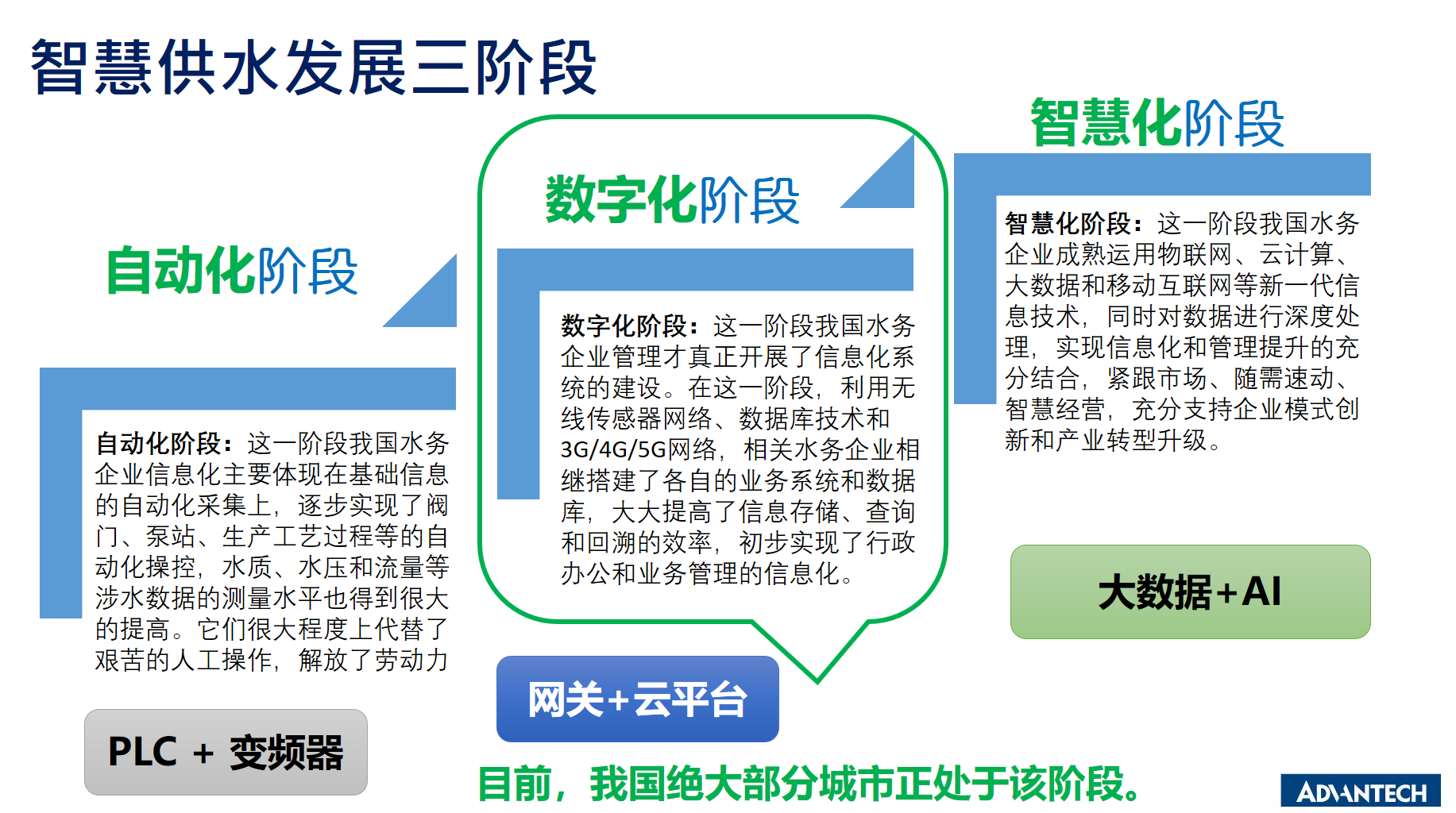 如圖3所示,目前大多供水管理系統(tǒng)還處于“數(shù)字化”階段,研華科技會(huì)一如既往的協(xié)同專(zhuān)業(yè)伙伴,借助工業(yè)云平臺(tái)、AI、邊緣智能等技術(shù)與產(chǎn)品方案,共同加速推動(dòng)供水智慧化應(yīng)用落地。