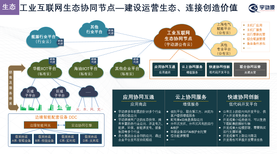 在協同共享方面,宇動源通過公有云建設工業互聯網的生態協同節點,將行業應用轉換代理鏈接到行業已有平臺的私有云內,供區域的子平臺使用;以平臺鏈接為基礎,實現產業上下游融合、服務商新模式探索以及產學研流程化的改造,真正實現能源行業生態良性發展和企業平臺的價值釋放。