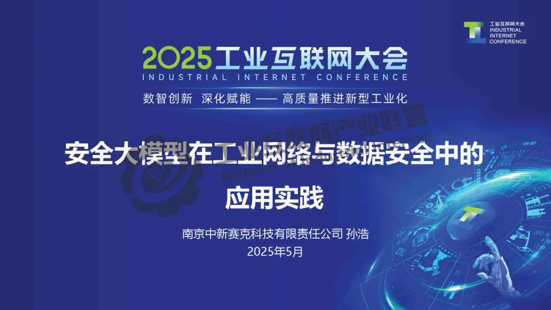 5月23日,在2025工業互聯網大會“新型工業化網絡與數據安全專題活動”上,南京中新賽克科技有限責任公司副總經理孫浩發表了《安全大模型在工業網絡與數據安全中的應用實踐》的主題演講。