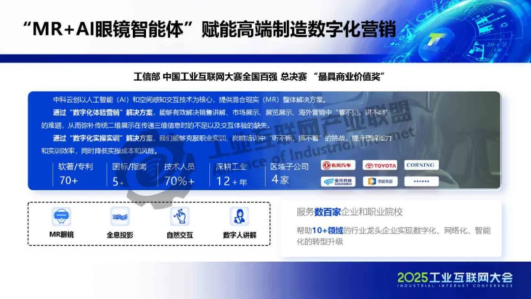 王哲介紹,中科云創(chuàng)針對(duì)高端制造營(yíng)銷(xiāo)轉(zhuǎn)型困境,提出"產(chǎn)品+服務(wù)"和"銷(xiāo)售+服務(wù)"全鏈路解決方案,推動(dòng)從單純賣(mài)設(shè)備向全周期價(jià)值服務(wù)升級(jí),通過(guò)"MR+AI眼鏡智能體"技術(shù)賦能,實(shí)現(xiàn)從訂單交付到客戶(hù)全周期運(yùn)營(yíng)的數(shù)字化營(yíng)銷(xiāo)轉(zhuǎn)型,典型實(shí)踐驗(yàn)證了其有效性,未來(lái)將致力于打通"制造-銷(xiāo)售-服務(wù)"全鏈條協(xié)同。