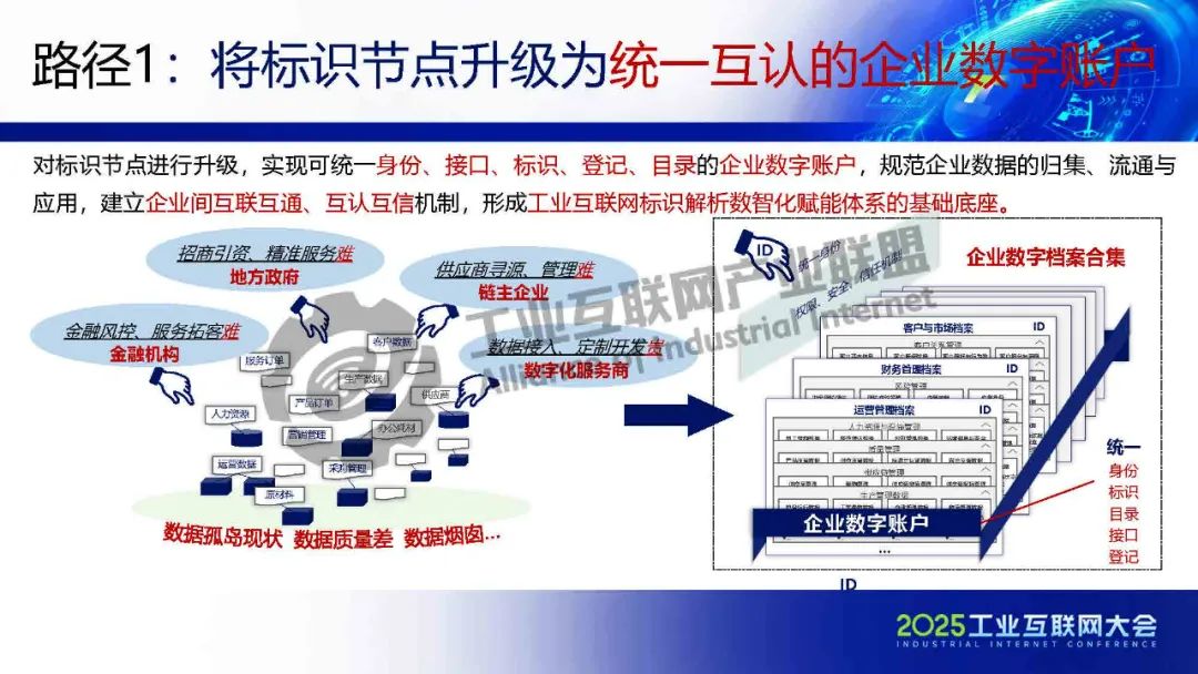 對標識節點進行升級,實現可統一身份、接口、標識、登記、目錄的企業數字賬戶,規范企業數據的歸集、流通與應用,建立企業間互聯互通、互認互信機制,形成工業互聯網標識解析數智化賦能體系的基礎底座。