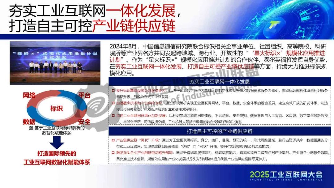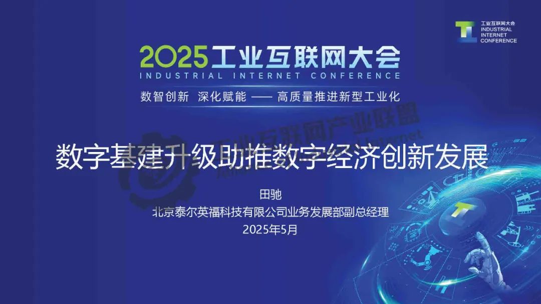 5月23日,在2025工業互聯網大會“工業互聯網標識解析貫通專題活動”上,北京泰爾英福科技有限公司業務發展部副總經理田馳發表了《數字基建升級助推數字經濟創新發展》的主題演講。
