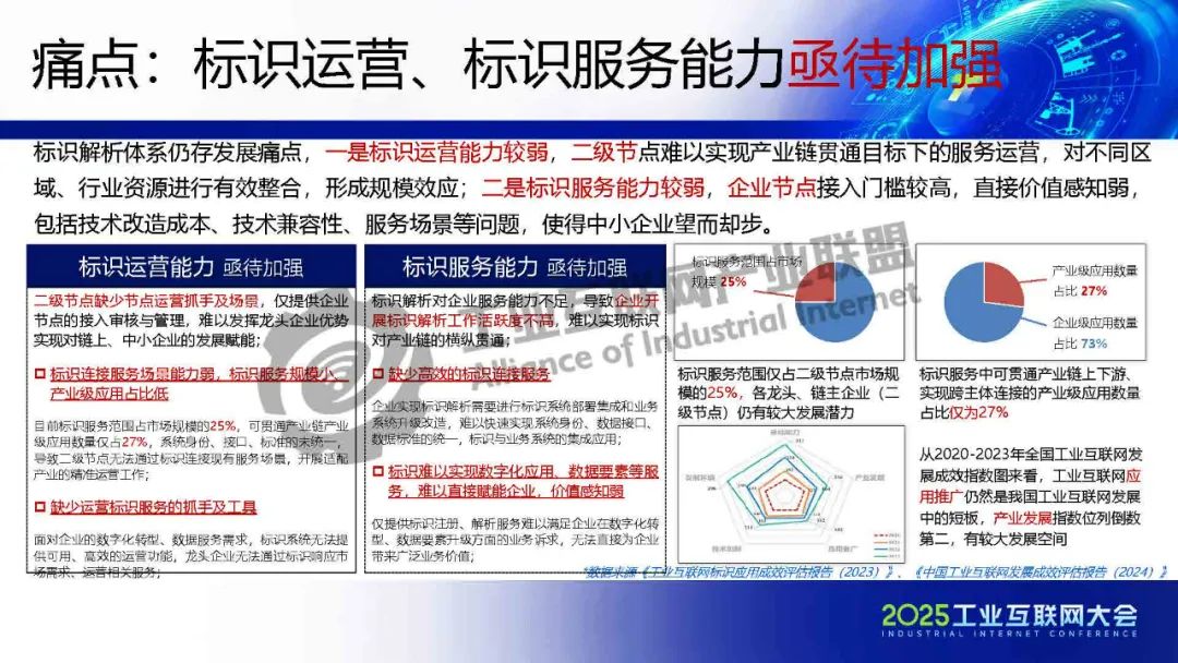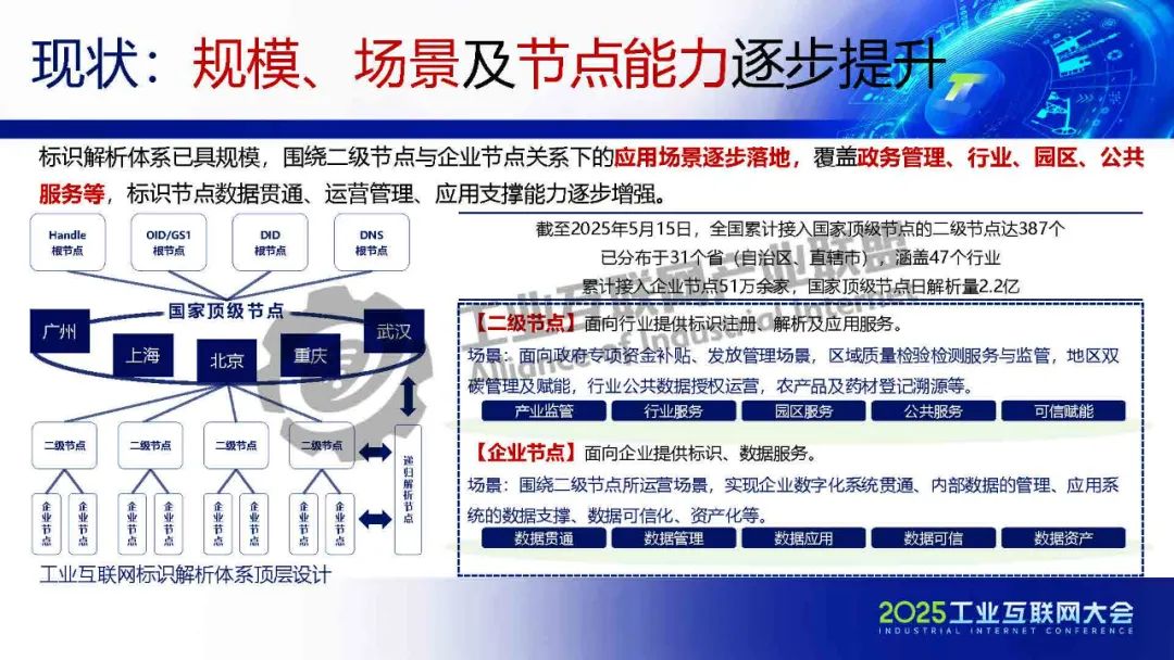 田馳介紹,標識解析體系已具規模,圍繞二級節點與企業節點關系下的應用場景逐步落地,覆蓋政務管理、行業、園區、公共服務等,標識節點數據貫通、運營管理、應用支撐能力逐步增強。政策及產業的發展對標識解析體系提出了更高的要求和挑戰。基于工業互聯網標識解析的工作基礎及成果,建設可兼具差異性、關聯性、橫縱聯動,并支撐應用與數據服務融通的工業互聯網標識解析數智化賦能體系,加強標識服務及節點運營能力建設,驅動工業互聯網一體化發展,加速標識解析實現各領域產業鏈貫通。