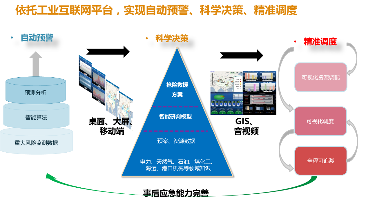 項目建成了覆蓋集團各層級、全產業的應急管理、指揮體系,實現涵蓋突發事件的預防、準備、響應、恢復的整個全流程的應急管理系統。以大數據驅動的工業互聯網平臺為支撐,利用其豐富的智能算法,實現各類重大風險的預測預警,并以桌面、大屏、移動端等多種告警方式及時、自動通知到各級調度中心領導和應急值守人員;基于應急預案和各類應急資源數據,結合產業領域知識,建立智能研判模型,提供搶險救援方案以支撐應急指揮決策;實現了GIS、音視頻等多媒體手段,來提供可視化的應急資源調配、應急響應調度和全程可追溯;并通過應急恢復階段的評估分析、案例歸檔來完善應急管理體系。因此,通過應急指揮系統,建立起涵蓋從監測預警到研判、響應、總結的閉環的應急能力建設體系。