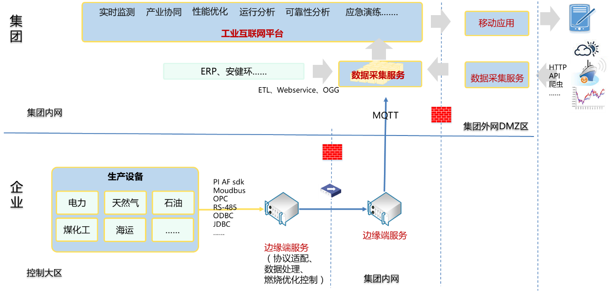 在集團工業互聯網平臺中,部署數據采集服務,接入內網的ERP、安健環等經營管理類數據,接入通過單向隔離網閘擺渡的生產實時數據和外部數據。通過企業端部署的邊緣端服務安全地采集生產實時數據;通過外網DMZ部署的數據采集服務,安全接入外部的氣象、船舶AIS、煤炭價格指數等數據。