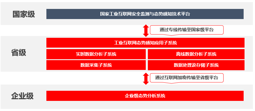 面向省級的工業互聯網安全監測與態勢感知系統是構建全方位的工業互聯網安全綜合保障網絡體系的重要基礎。通過打造企業內部工業互聯網態勢感知系統,完成態勢的細粒度分析,并將態勢感知系統與省級工業互聯網安全監測與態勢感知系統聯動,實現省級工業互聯網安全全面及實時的監測。