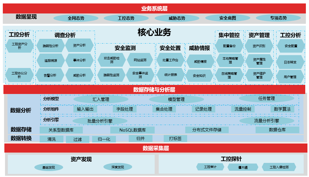 (1)業務系統層:通過安全監測、安全預警、快速處置、追蹤溯源等業務功能,提供多維度態勢統計分析與展示,不但支持全網態勢、工控態勢、威脅態勢、安全底圖態勢、安全處置態勢等,而且還包括針對客戶關注的專享態勢,如資產態勢、脆弱性態勢、攻擊態勢、僵木蠕態勢、網站監測態勢等展示。