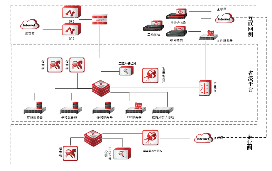 本項目主要是在互聯網側、省級平臺和企業側實施的部署:在互聯網區(運營商)部署漏掃產品,通過網絡隔離設備導入內網FTP服務器,再接入省級平臺,向省級平臺傳輸監測數據,部署DPI流量分析設備,可為工控入侵檢測提供原始工控流量,為僵木蠕提供全網抽樣流量;省級的態勢感知平臺部署在核心區,通過對接收的企業側和互聯網側的檢測數據進行綜合分析,實現省級工業互聯網安全全面及實時的監測;在某省企業區域部署企業級的態勢分析系統及僵木蠕、工控審計等探針,向省級態勢感知平臺提供監測數據。